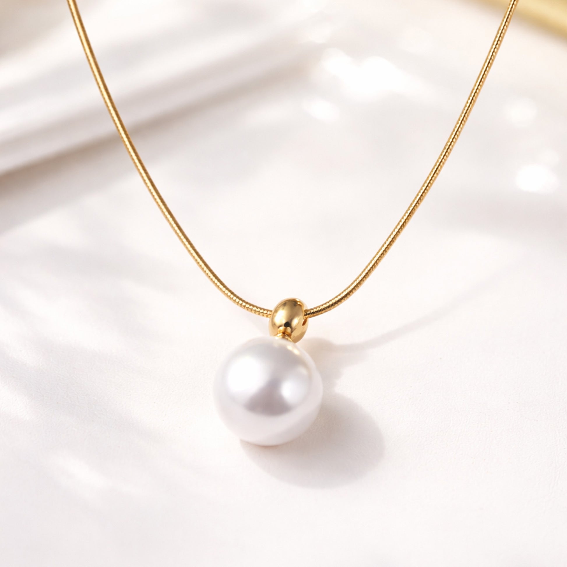 This necklace features a polished gold-tone snake chain with a delicate 1cm pearl pendant, creating a clean and timeless style that matches casual and formal outfits.